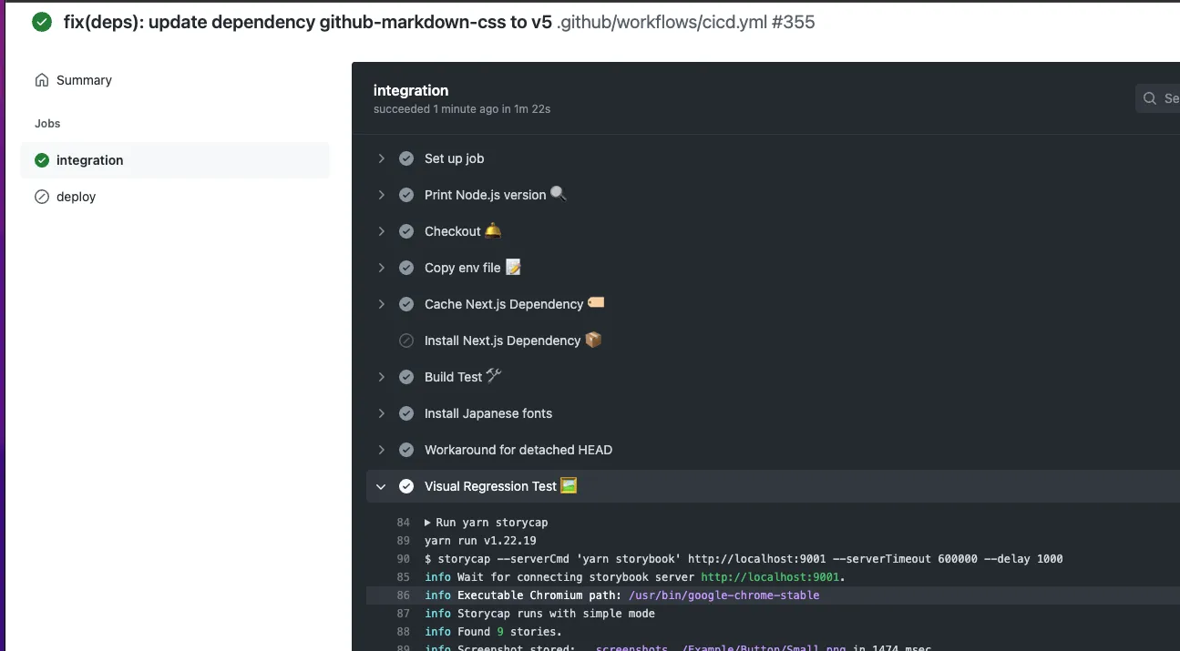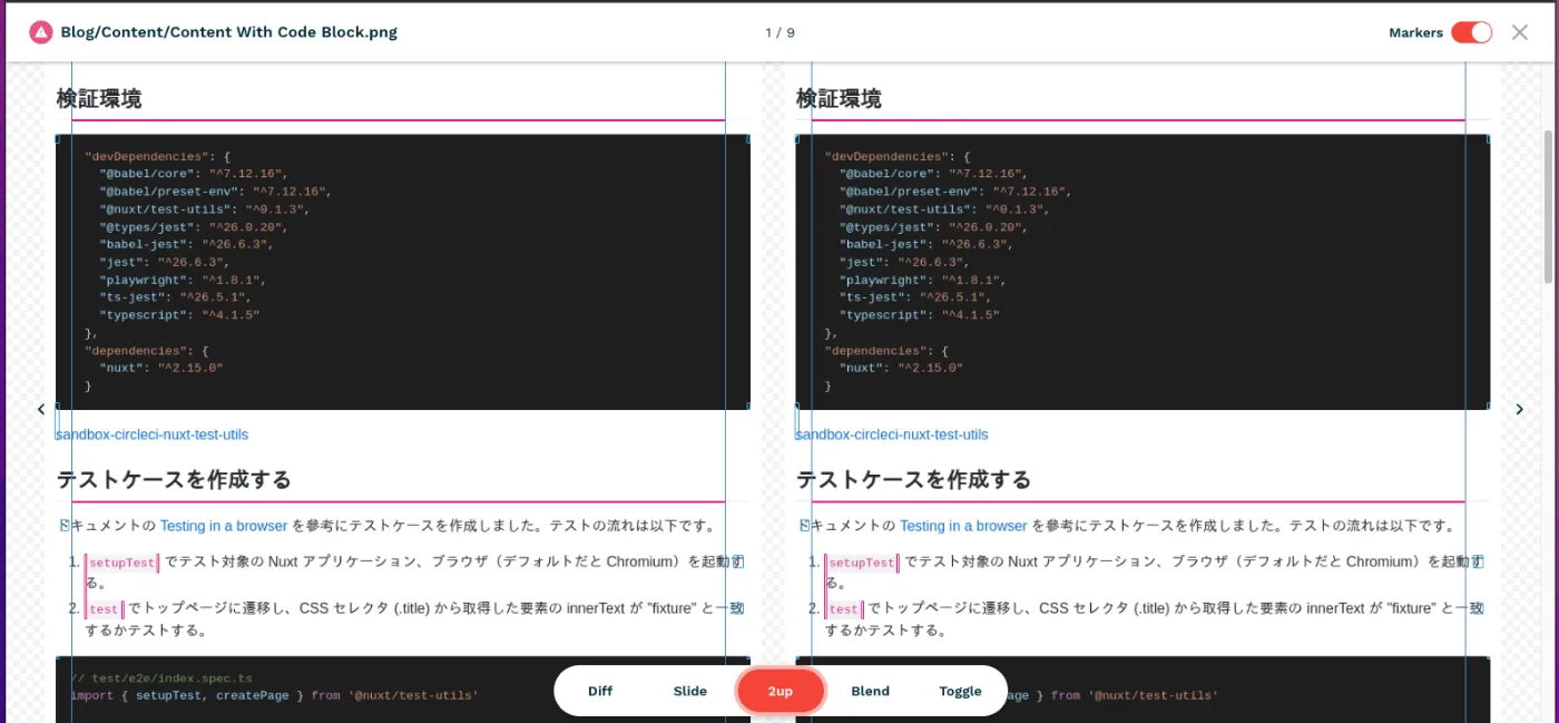 ユニットテストやNext.jsのビルドでエラーにならないので目視で確認しないと気付きませんでした。こういった影響をライブラリをアップデートするたびに手動で確認するのは手間だなと思ったので、ある程度自動化できないかと思い方法を調べました。今回は以下の記事を参考にVisual Regression Testを使って視覚的な変化を検知する方法を試しました。