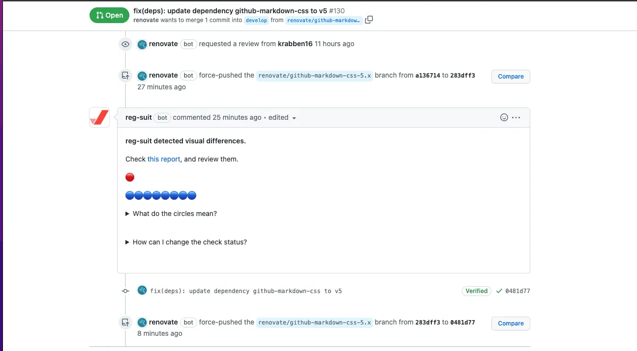 またVRTをCIで実行することで修正による影響の確認フローを自動化できます。PRを作ると基点ブランチとfeatureブランチのスナップショットを比較して結果をPRにコメントするような仕組みを構築できます。