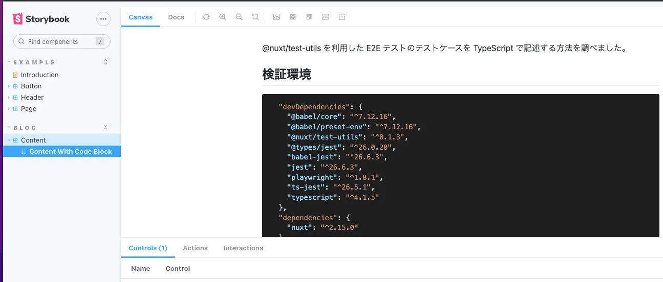 "storybook": "start-storybook -p 9001",背景色が変化しているあたりのコンポーネントをストーリー(Content With Code Block)として作成しました。