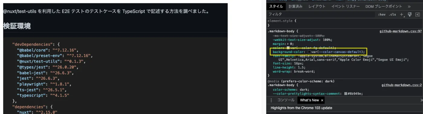 github-markdown-cssのソースを確認するとメディアクエリのprefers-color-schemeが dark のときに上記の背景色が設定されるようです。
